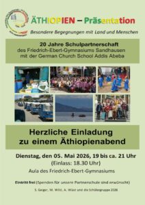 Wir laden Sie herzlich zu einer kurzweiligen Äthiopien-Präsentation ein, in der wir Ihnen unsere 20-jährige Schulpartnerschaft, das Land sowie unsere vielfältigen Aktivitäten vorstellen möchten. Diese reichen von gemeinsamen Unternehmungen mit Schüler*innen und Lehrkräften der GCS über Ausflüge in die Umgebung, Vorträge und Besuche bei den United Nations, in der Deutschen Botschaft, bei der Gesellschaft für Internationale Zusammenarbeit (GIZ) bis hin zu Besuchen bei Nichtregierungsorganisationen wie „Brot für die Welt“.