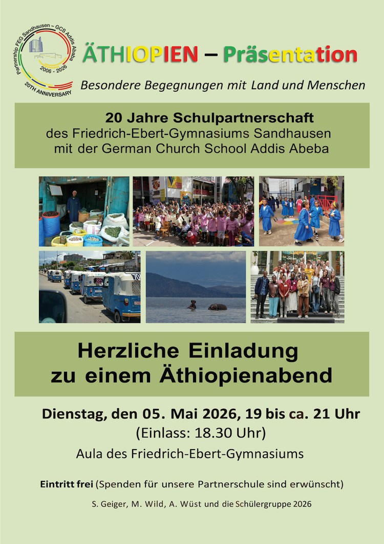 Im März 2026 hatte erneut eine Gruppe der Jahrgangsstufe 11 des Friedrich-Ebert-Gymnasiums die Gelegenheit, unsere Partnerschule, die German Church School in Addis Abeba (Äthiopien), zu besuchen. Die zweieinhalb Wochen waren für alle Beteiligten spannend, eindrücklich und sehr intensiv, da die Lebenswelt in Äthiopien in vielen Bereichen deutlich von unserem Alltag abweicht, zugleich aber auch viele Gemeinsamkeiten sichtbar wurden.