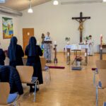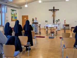 Der bisherige Schrankraum im Mauritiushaus wurde leergeräumt, dort ist jetzt die Sakristei eingerichtet. Die Tische aus dem großen Saal lagern nun im Keller. Im Saal wurden die Stühle mit einem Mittelgang wie in der Kirche aufgestellt. Aktuell stehen 100 Stühle, bei Bedarf kann die Bestuhlung aber auch erweitert werden. Den Blickfang an der Rückwand des Saals bildet das große Kreuz aus der barocken Kreuzigungsgruppe, das hinten in der Kirche hing.